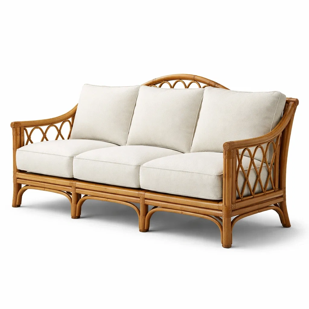 Divano a tre posti con struttura realizzata in rattan naturale. I cuscini, con superficie in tessuto di poliestere, sono completamente removibili. Le dimensioni del divano sono: lunghezza 180 cm, larghezza 75 cm, altezza 80 cm. Il peso netto è di 25 kg. Adatto per uso interno. I braccioli presentano un design intrecciato. Non richiede montaggio. Pulizia consigliata con aspirapolvere leggero o panno umido.