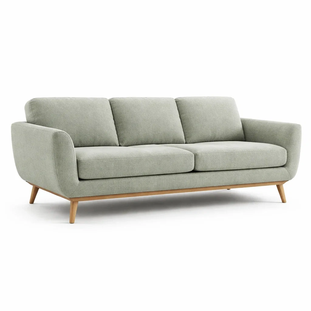Questo divano a tre posti presenta un rivestimento in tessuto poliestere di colore grigio chiaro. La struttura è realizzata in legno massello e le gambe sono in legno. Le dimensioni sono: lunghezza 210 cm, larghezza 85 cm, altezza 75 cm. Il materiale dell'imbottitura è in schiuma poliuretanica. I cuscini del sedile sono rimovibili e i braccioli imbottiti. Il divano è progettato per uso interno.
